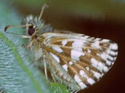 Kendetegn: En lille sortbrun bredpande med et vingefang på 2-2½ cm og med tydelige hvide prikker på oversiden af både for- og bagvinger.