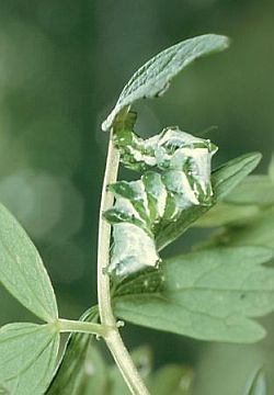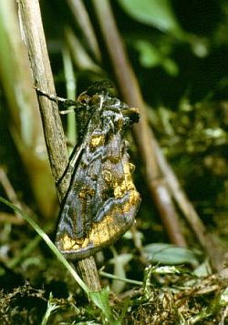 | Sommerfugl (imago) t.v. og voksen larve (th) af det gyldne c, Lamprotes c-aureum. (Foto: P. Stadel Nielsen) | |