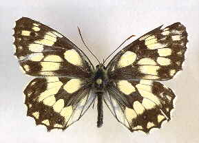 Fig. 1. Denne han af Melanargia galathea L. blev ved et lykketræf fanget på diget ved Bøtø d. 17.vii-1997 af Erik Nørager, Næstved. Eksemplaret er det første sikre danske fund. |