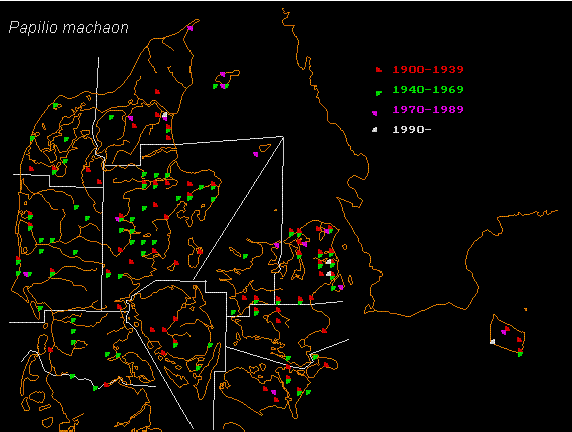 This species was resident in many places in Denmark until around 1975 when it disappeared from its last known locality. The main reason for this decline is clearly drainage of meadows and moors where its foodplant Peucedanum palustre is growing. We still have this foodplant in many places, but mostly the are overgrown with trees, so that P. machaon cannot use such places as habitats. It is also an open question if machaon was really resident by us, as most populations has been known for not so many years. However, in the 1940's it was wery common near lakes north of Copenhagen.