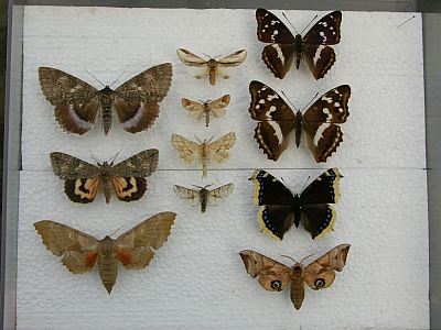 ![]() Nogle af de arter som kan forventes i sommerfugleskoven: tv fra oven: blåt ordensbånd (C. fraxini), rødt ordensbånd (C. nupta), poppelsværmer (L. populi), midt: porcelænsspinder (P. tremulae), lille måneplet (C. curtula), palpespinder (P. palpina), stor gaffelhale (C. furcula), th. iris han og hun (A. iris), sørgekåbe (V. antiopa) og aftenpåfugleøje (S. occelatus) |